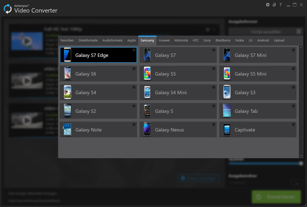 Du brauchst gar nicht wissen, welche Formate Dein Handy bevorzugt. Beim Ashampoo Video Converter wählst Du einfach das Gerät (Handy, Spielekonsole, etc.) aus und die Software erstellt automatisch das optimale Format. Unsere Spezialisten haben für alle gängigen Geräte exakte Format-Profile erstellt, damit Dein Video dort problemlos läuft.