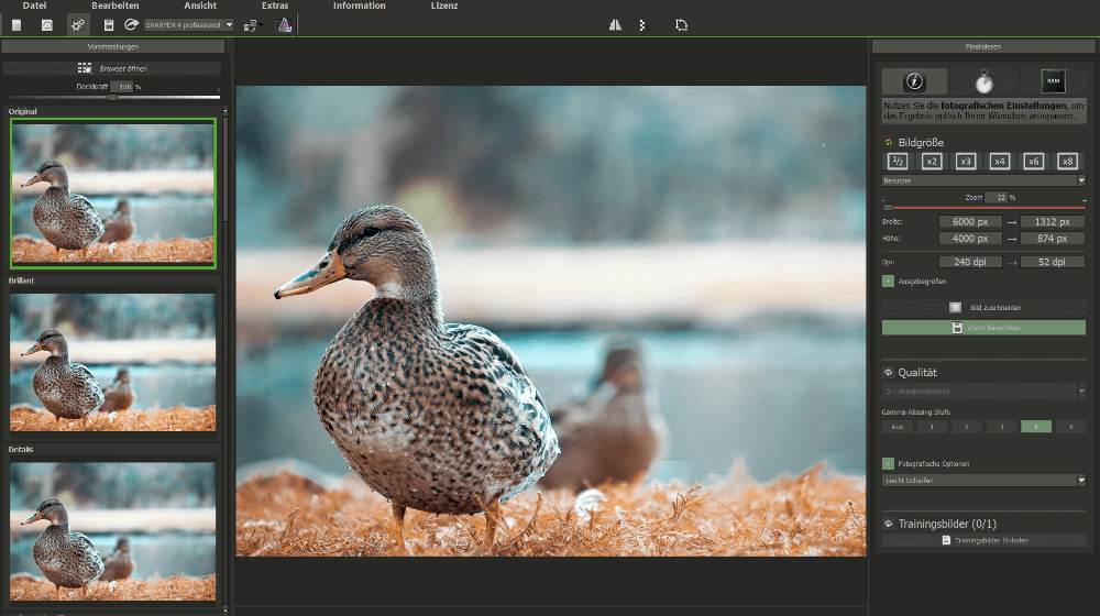 Ashampoo ZOOM #3 bietet eine übersichtliche Benutzeroberfläche, die sich an Deine Arbeitsweise anpasst. Bereiche wie Presets, Zoomansicht und Bildgrößeneinstellungen sind logisch angeordnet und lassen sich flexibel verschieben. Die Darstellung ist für HD und Ultra-HD optimiert, mit hilfreichen Tooltips und Vergleichsansicht samt Zoom-Lupe – damit Du immer den Überblick behältst.